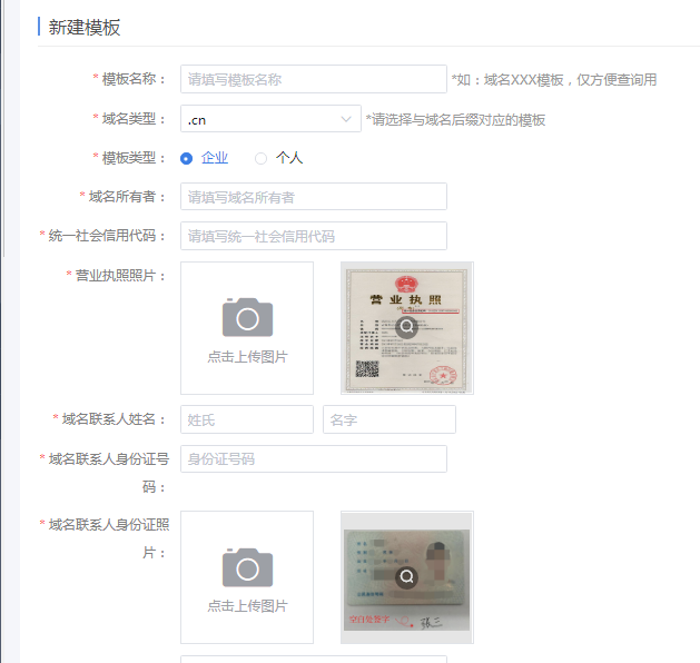 【模板管理】—【创建模板】,填写申请主体资料,申请主体分为企业,个人,不同类型的主体所提交的资料信息不同。(请务必先添加模板,然后提交的主体资料,以便注册域名时快速选择主体模板)。