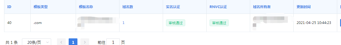 【模板管理】里实名认证和RNVC认证的状态要是如【审核通过】,则对应的域名管理状态会显示【正常】。域名模板约1个工作日审核通过