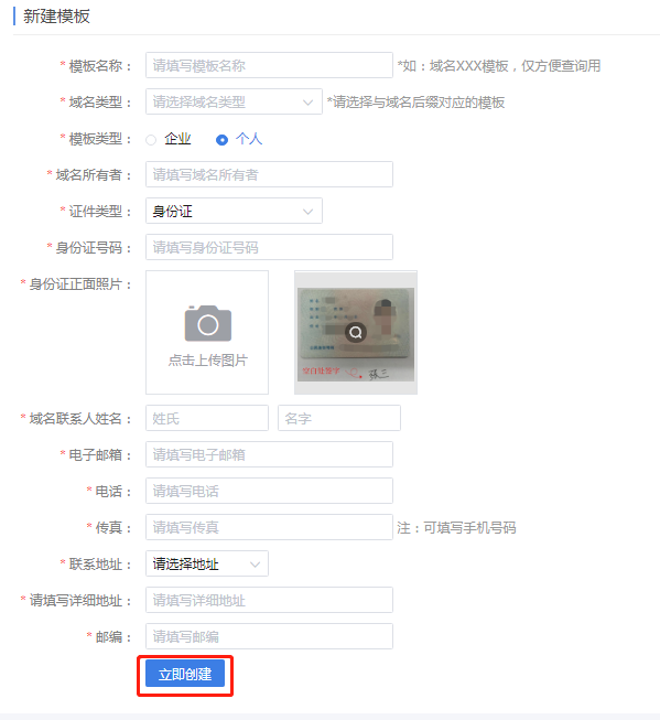 【模板管理】—【创建模板】,填写申请主体资料,申请主体分为企业,个人,不同类型的主体所提交的资料信息不同。(请务必先添加模板,然后提交的主体资料,以便注册域名时快速选择主体模板)。